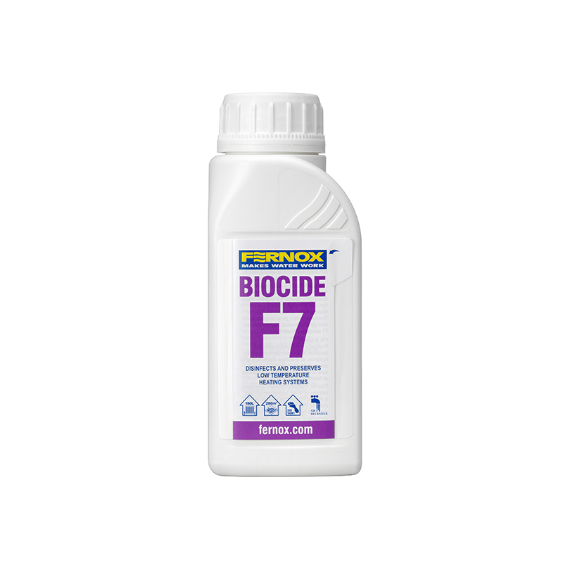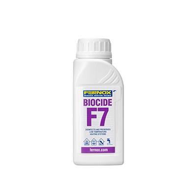 Biocide F7 protects against bacterial and fungal growth in residential heating and non-evaporative chilled water systems. Fernox strongly recommends dosing a Fernox Protector, such as Protector F1 or Antifreeze Alphi-11, alongside Biocide F7 to offer full system protection against corrosion and scale, and to maintain energy efficiency levels.