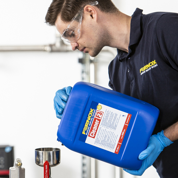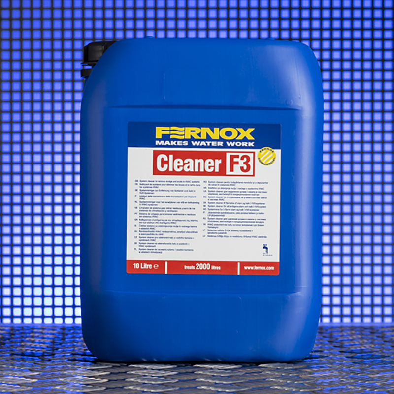 Fernox Cleaner F3 is supplied in 10 litre containers. Fernox Cleaner F3 is classified as non-hazardous, but as with all chemicals: Keep out of reach of children. Do not mix with other chemicals. In case of contact with eyes or skin, rinse immediately with plenty of water.